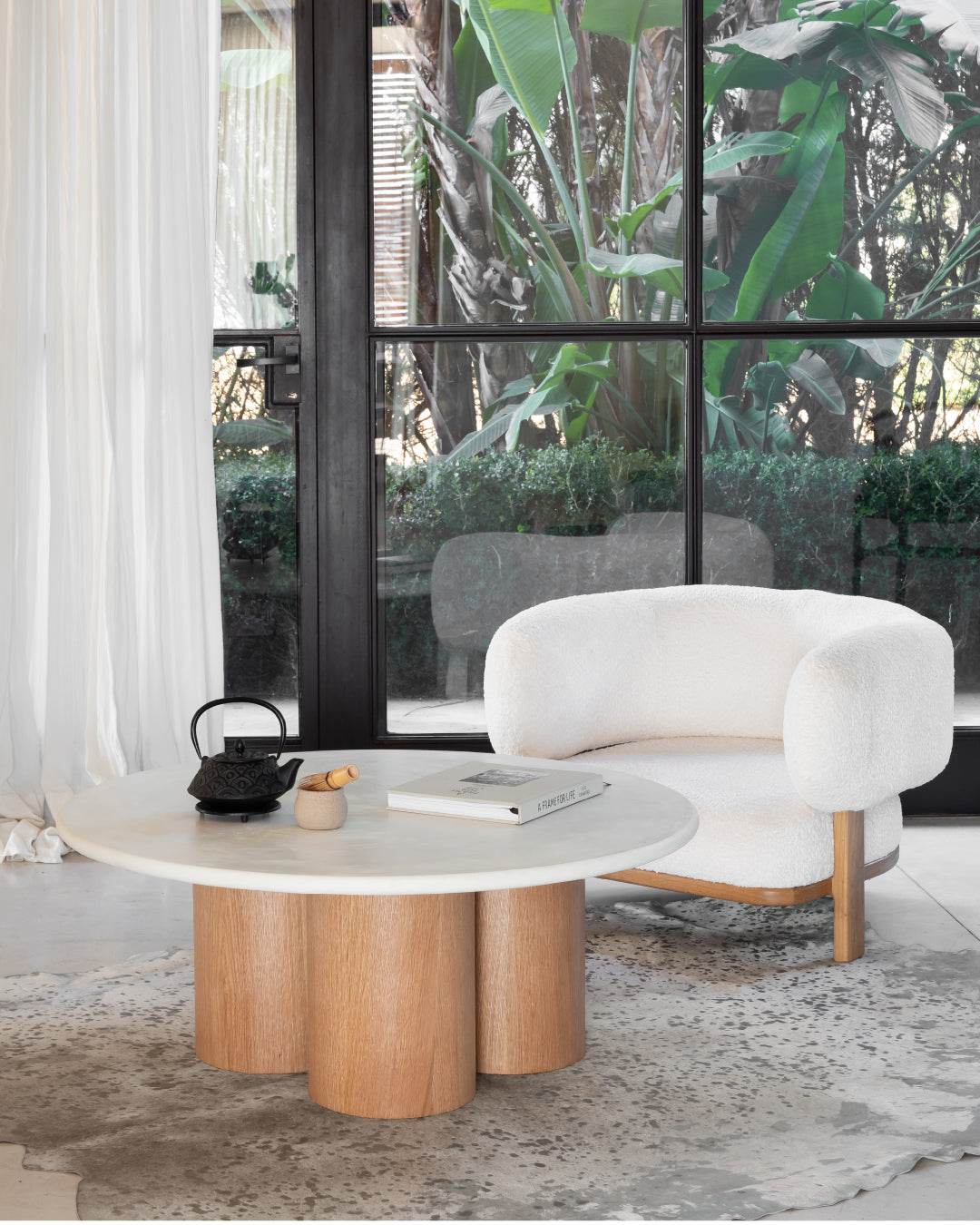 Con un diseño sobrio y materiales nobles, la mesa Saiko combina un sobre redonda de microcemento blanco con una base de tres bases cilíndricas enchapadas en roble americano. Su estructura robusta y su estética minimalista la convierten en una pieza funcional y armónica para espacios de estar contemporáneos.